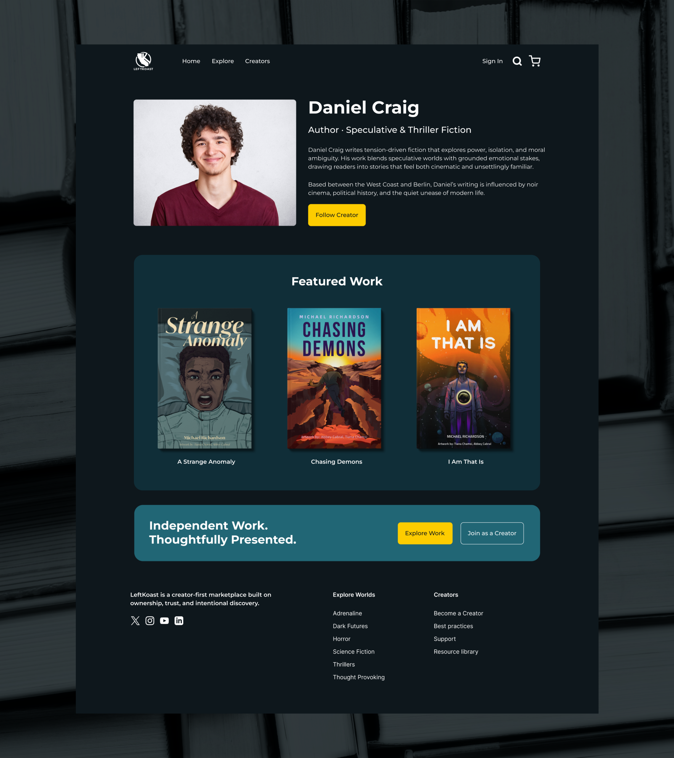 I redesigned the homepage and creator page to clearly communicate what LeftKoast is, who it is for, and how it differs from existing marketplaces. The visual direction focused on a cinematic, dark blue palette to establish a premium and trustworthy tone, while allowing featured products and creators to stand out.