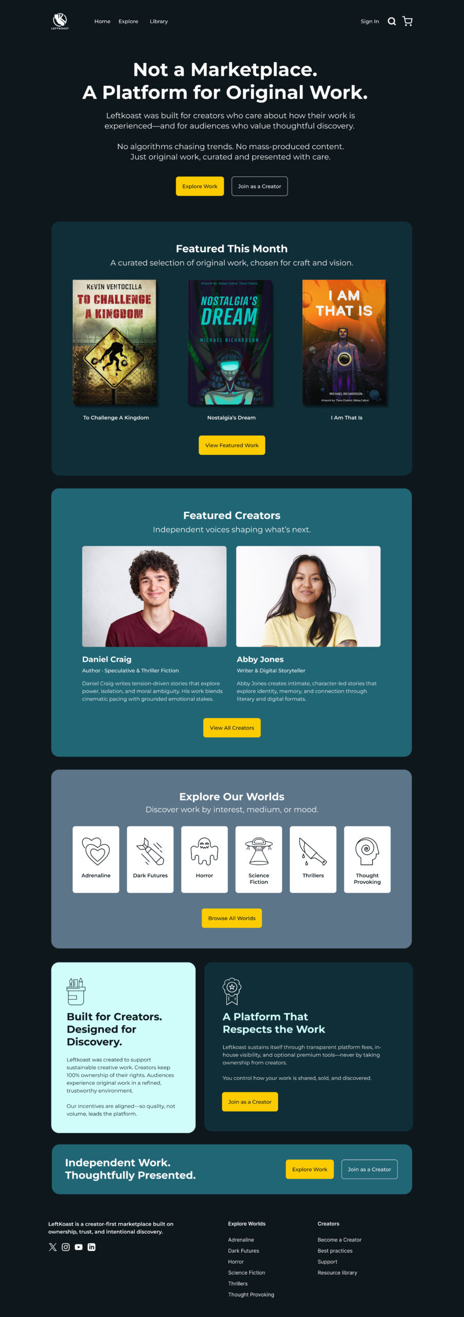 LeftKoast set out to create a curated ecommerce platform for independent creatives to sell digital products, beginning with books and expanding into additional categories over time. The existing site lacked a clear value proposition, defined calls to action, and structured content to support discovery and trust.